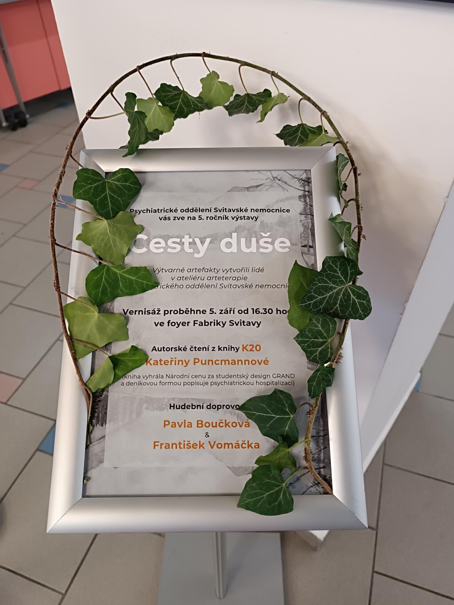 Součástí vernisáže bylo autorské čtení z knihy K20, kterou napsala grafická designérka Kateřina Puncmannová. Její kniha vyhrála Národní cenu za studentský design GRAND a autorka se v ní rozhodla sdílet s veřejností svůj životní příběh s cílem prolomit stigmatizaci psychiatrické péče. Název knihy K20 je odvozen od názvu Resocializačního a psychoterapeutického oddělení v Psychiatrické nemocnici v Kosmonosech a její obsah představuje témata jako život v komunitě, terapeutické metody nebo pohled rodiny a přátel. „Líbilo se nám, že poselstvím knihy je řešit problémy, které přicházejí a neodkládat je, naopak zjistit, jak můžeme problém odstranit nebo zmírnit. To je totiž základem terapeutické péče i na našem psychiatrickém oddělení,“ zakončila Martina Blaževská, vrchní sestra manažerka interních oborů.