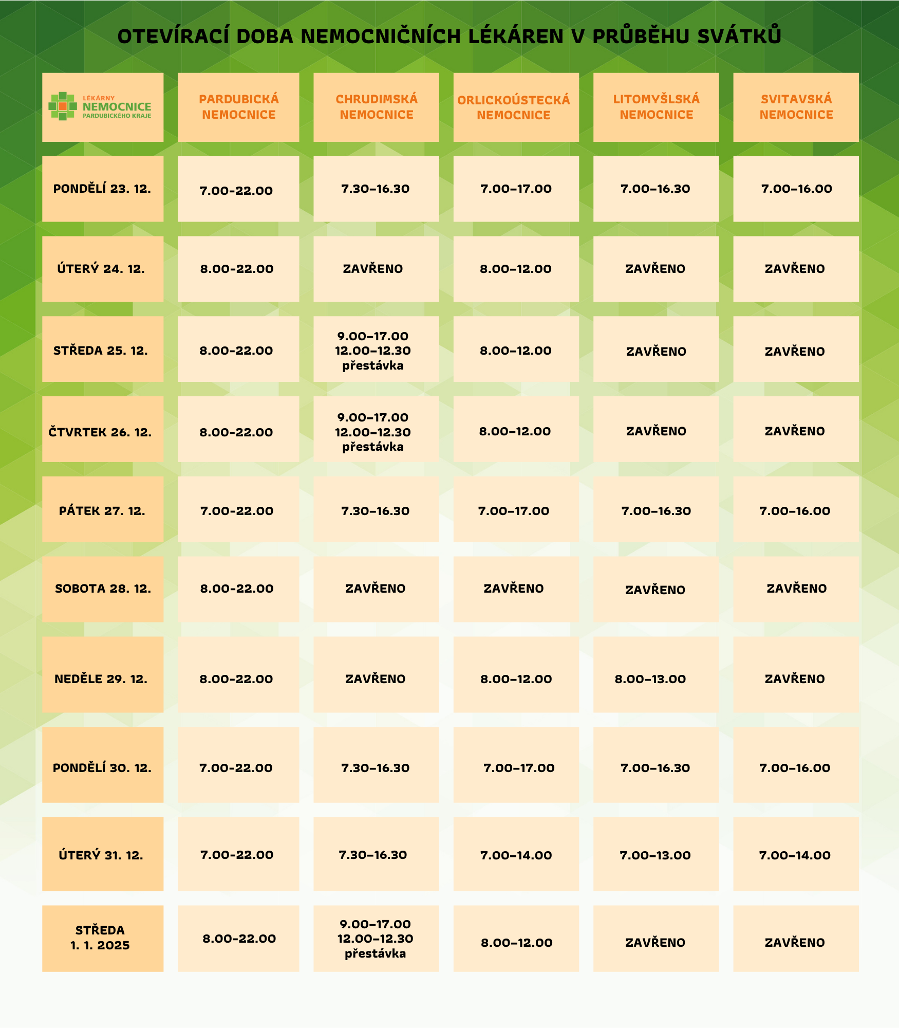 Otevírací doba nemocničních lékáren během vánočních svátků a na přelomu roku 2024/2025: