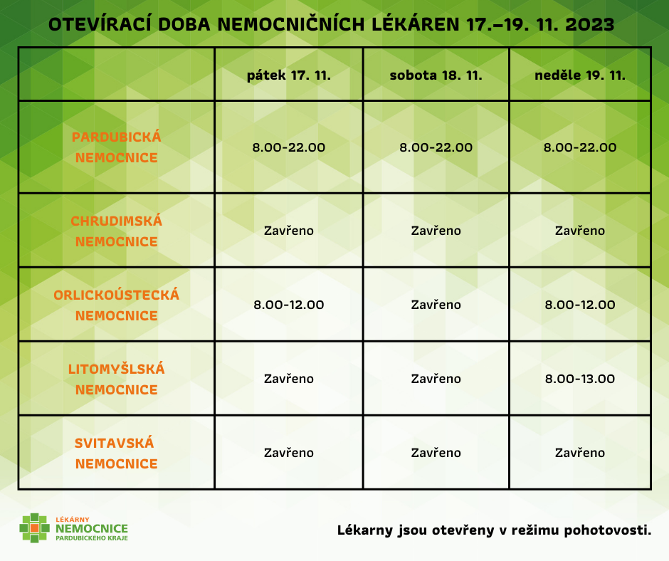 Otevírací doba lékáren Nemocnice Pardubického kraje v pátek 17. listopadu 2023, na který připadá státní svátek, a o následujícím víkendu, tedy v sobotu 18. a neděli 19. listopadu 2023: