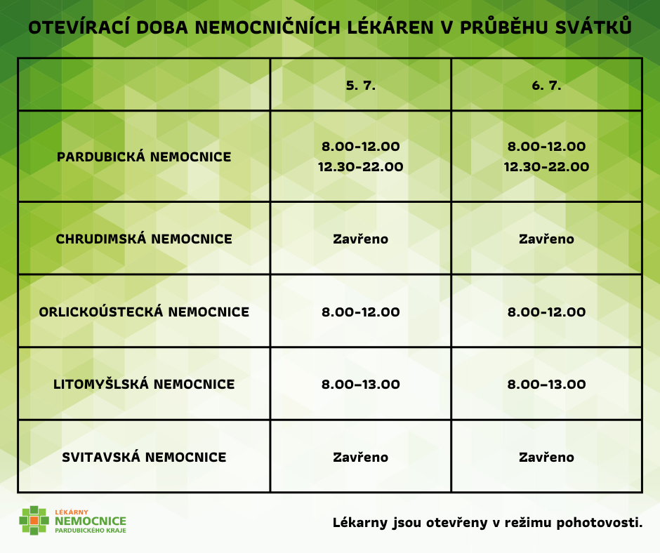 Provozní doba lékáren Nemocnice Pardubického kraje o svátcích 5. a 6. července