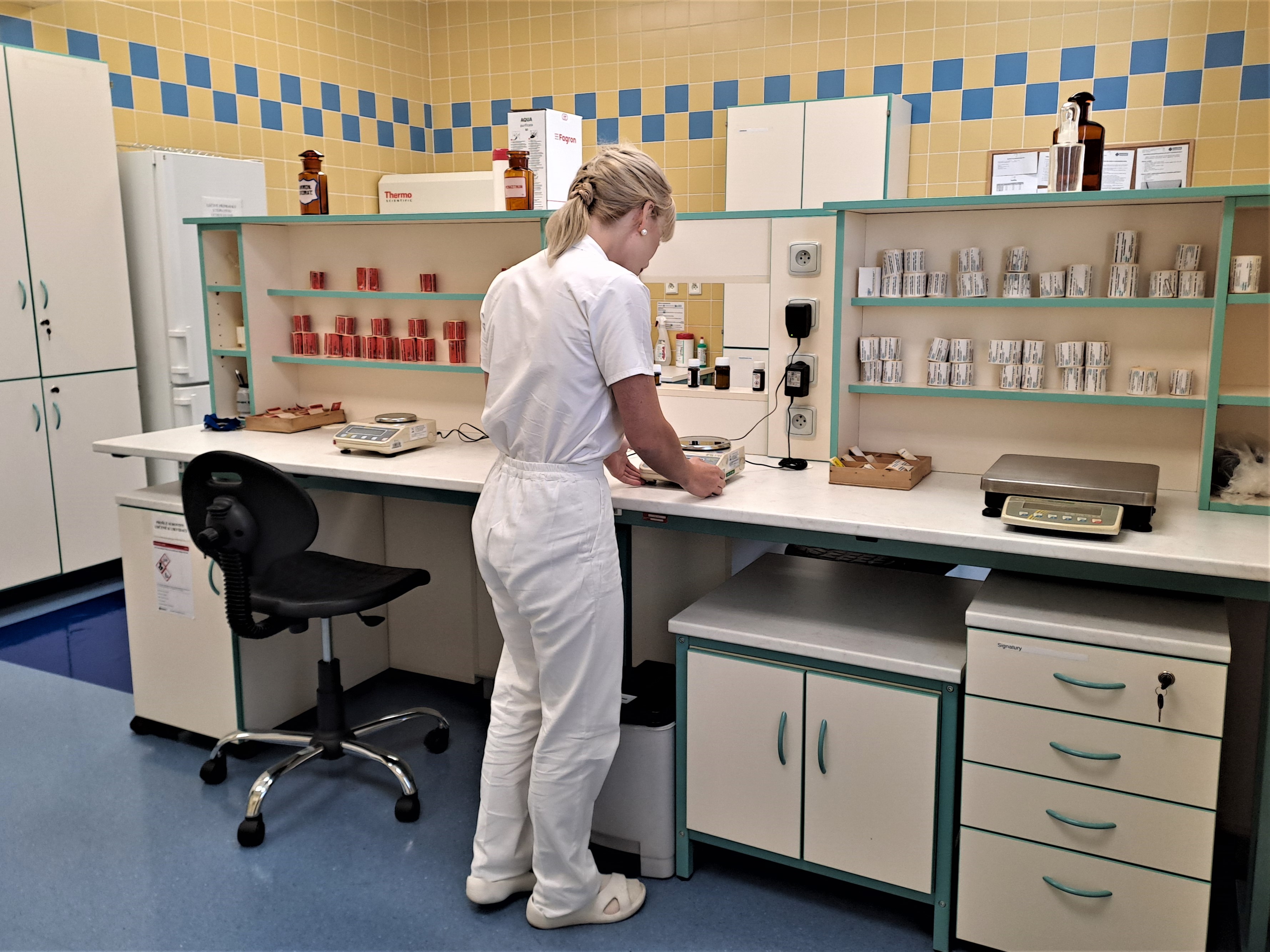 Laboratoř pro přípravu léčiv má vyšší úroveň čistoty a danou teplotu. To znamená, že tam nemůže přijít každý a nelze také kvůli prachu a teplu otevírat okna, proto v místnosti stále běží klimatizace. Jedním z nejdůležitějších přístrojů pro přípravu léků jsou digitální váhy, v laboratoři je jich hned několik: „Liší se mírou přesnosti, je to od půl gramu po miligramy,“