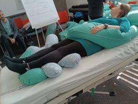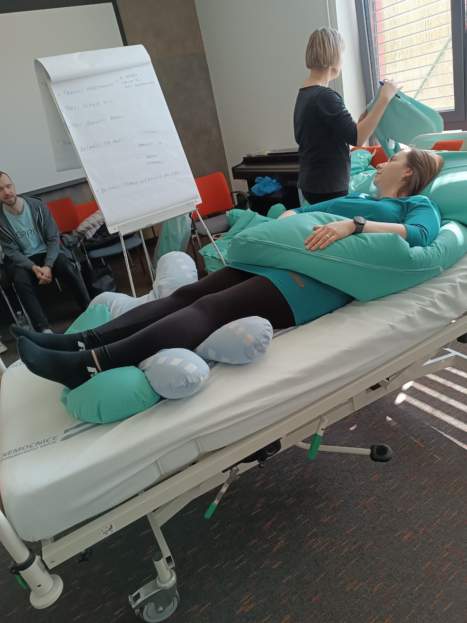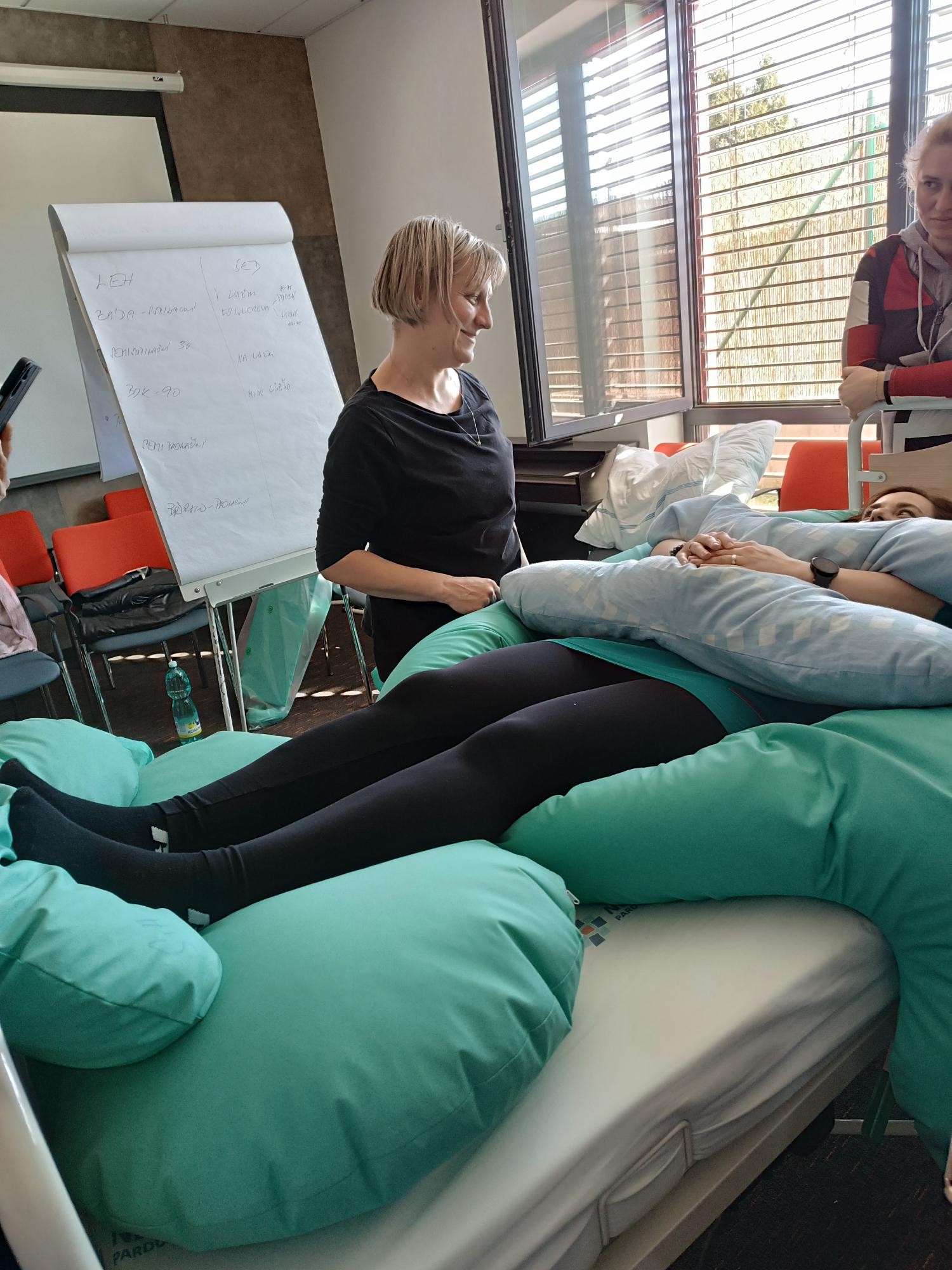 Také si procvičili, jak mohou pacienta pomocí polohovacích pomůcek napolohovat tak, aby to pro zdravotníka bylo co nejjednodušší a s co nejmenší námahou, a přitom pro pacienty více účelné a pohodlné. Kurz byl proložen také teoretickou částí, při které si všichni zopakovali vědomosti o dekubitech, zásadách polohování a druzích poloh, o problematice imobilizačního syndromu, o polohování klientů s neurologickou polohou a mnohé další.