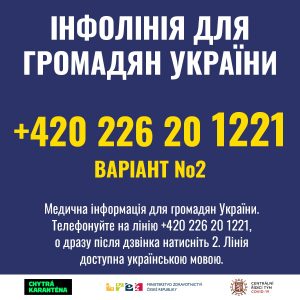 Якщо у Вас виникли питання щодо охорони здоров’я громадян України, звертайтесь на інформаційну лінію +420226201221 – варіант № 2, який працює щодня з 8:00 до 19:00. Лінія використовується для спілкування чеською, українською та російською мовами, навіть для випадків перекладу на чеську для медичних працівників.